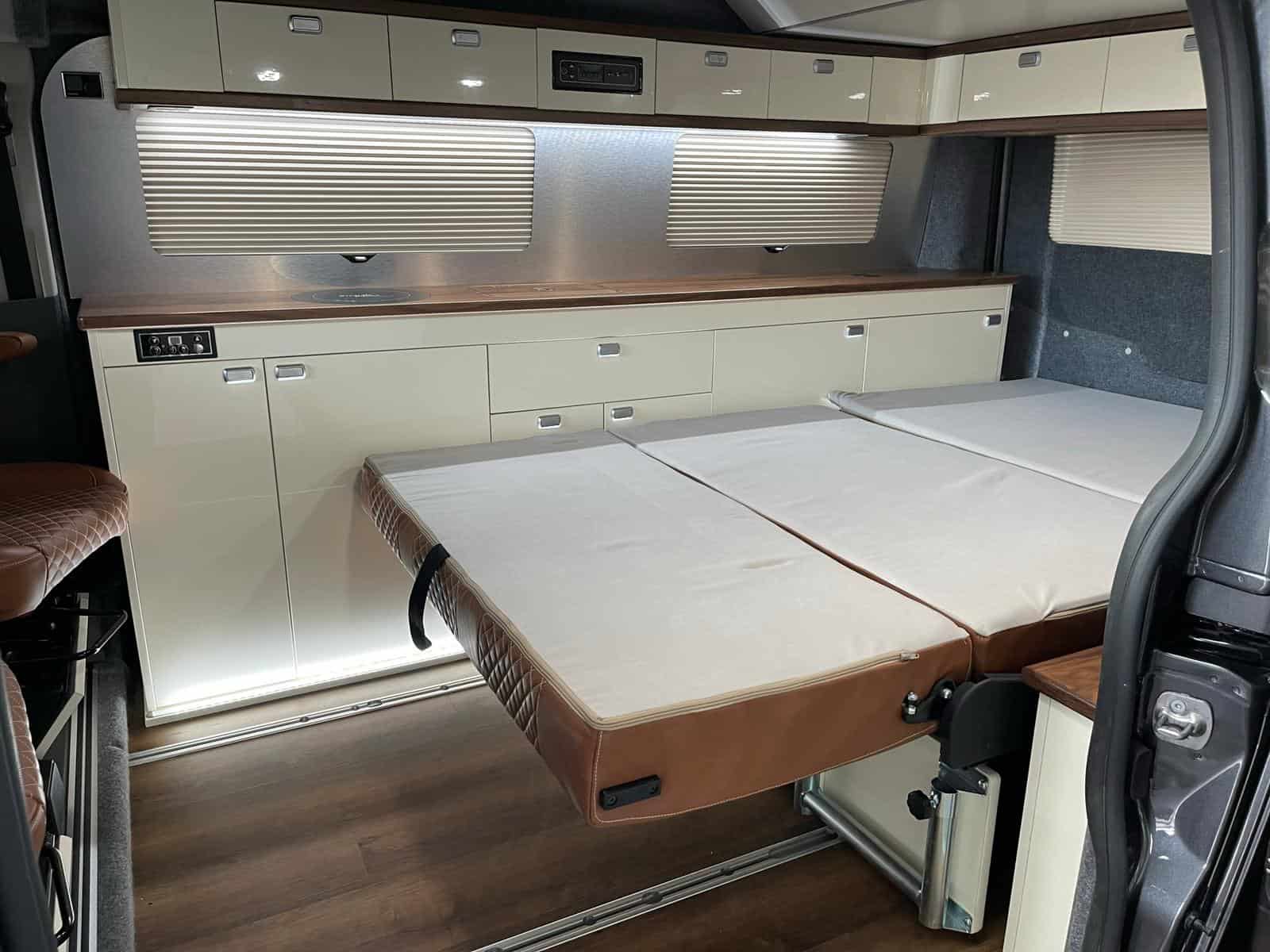 All furniture, kitchen units and cabinetry are designed and produced in-house on our own CNC machines unique to Knights Campers and built to fit your Transit Custom precisely.